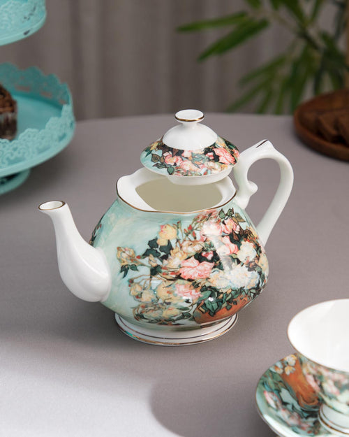 Delicate porcelain tea set with floral motifs for an elegant tea experience.