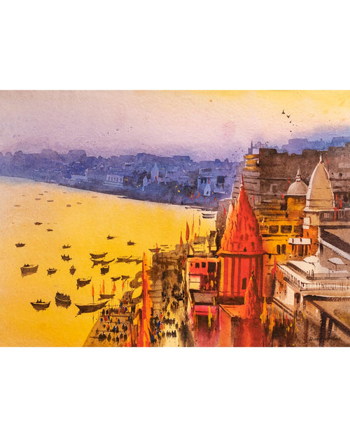 Banaras Ghat - Watercolor Painting: Capturing the serene vibrancy of the holy city at dusk, this artwork radiates with the soul of the Ganges.