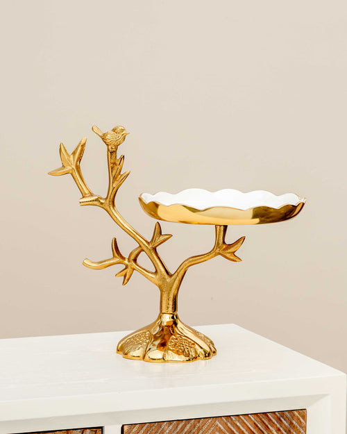 Cake Stand Featuring Whimsical Bird Design: This cake stand boasts a whimsical bird design, with branches and leaves in gold, offering an enchanting perch for your sweet creations.