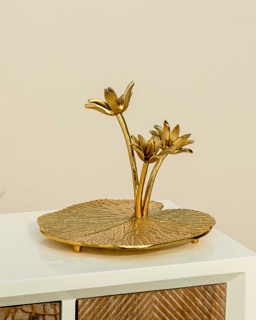 An exquisite decorative lotus flower with leaf cake stand, finished in gold to add a touch of elegance and sophistication to your dessert presentation.
