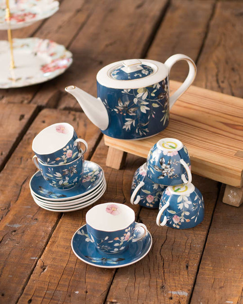 The Fluorescence Blue Tea Set: a delightful assemblage with blooming florals on a deep blue canvas, perfect for infusing tradition and tranquillity into tea time.