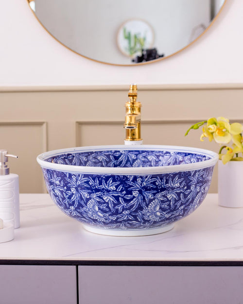 Foliage Blue & White Porcelain Counter Top Basin: A classic blue and white porcelain countertop basin, featuring a timeless floral design that adds a touch of sophistication to the space.