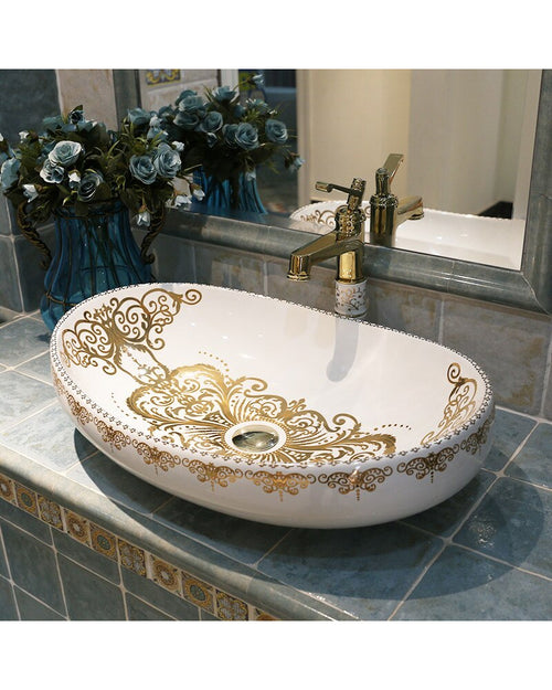 Medallion Porcelain CounterTop Basin: An elegant oval countertop basin adorned with ornate golden filigree, exuding classic charm and refined luxury.