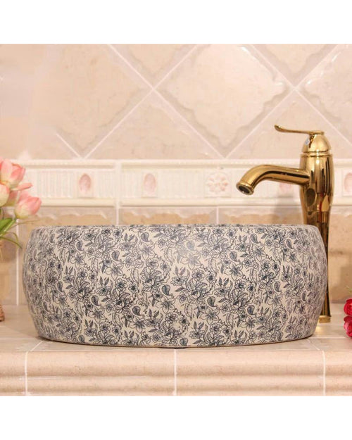 Floral Pattern Porcelain Counter Top Basin: An elegant vessel basin adorned with intricate floral patterns, offering a classic and refined touch to the bathroom’s design.