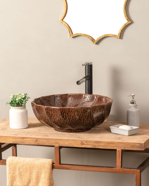 Retro Porcelain Counter Top Basin: A rustic, geometrical countertop basin with a rich, tiger's eye pattern, adding an earthy yet luxurious element to the bathroom decor
