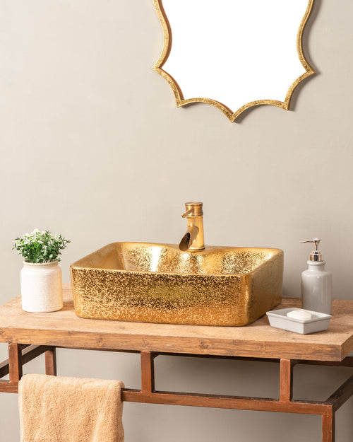 Beaten Metal Finish Ceramic Counter Top Basin - Dynasty I: An opulent gold-finished rectangular ceramic countertop basin that brings a splash of glamor and sophistication to the bathroom space