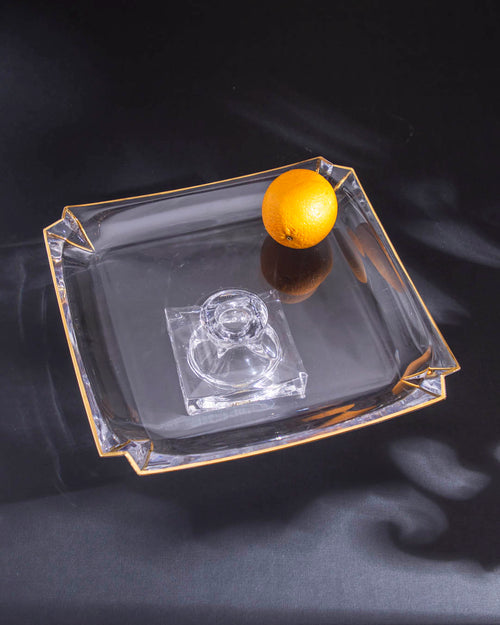The Crystal Glass Rectangular Serving Tray: a minimalist yet elegant piece, featuring sleek lines and subtle gold accents for a touch of refined simplicity.