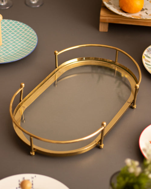 The Airin Gold & Glass Serving Tray: a chic and elegant accessory, its gleaming gold frame and clear glass base are perfect for sophisticated entertaining.