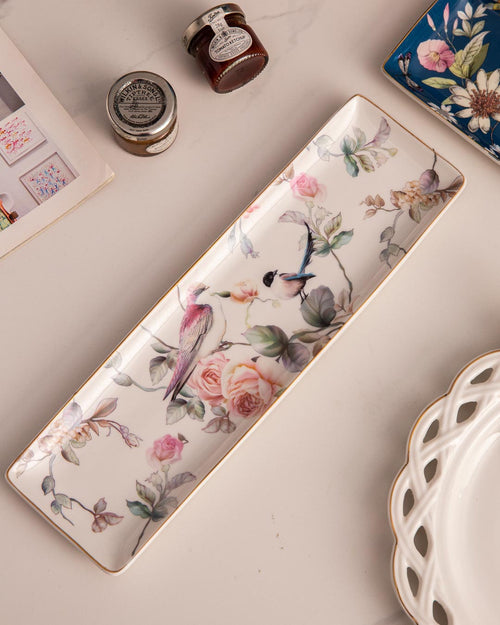 The Mayfair Rectangular Serving Tray in White: an exquisite piece adorned with soft floral and bird illustrations, perfect for adding a touch of elegance to any occasion.