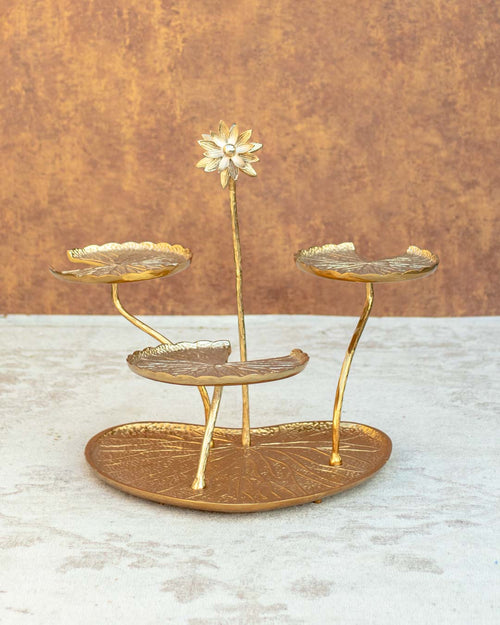 Luxe Lace Jewellery Organiser: A golden jewellery organiser with leaf-inspired tiers and a blooming flower detail, artfully crafted to display and organise your treasured pieces.