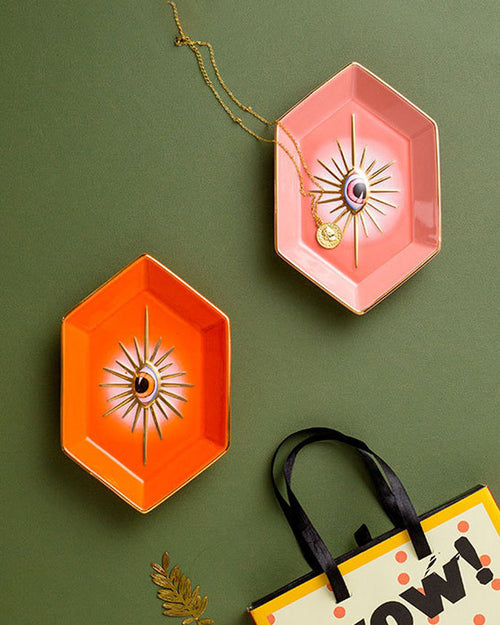 Evil Eye Hexagonal Ring Dish: Vibrant hexagonal jewellery trays with a striking sunburst design, perfect for adding a pop of colour and organisation to your dressing area.
