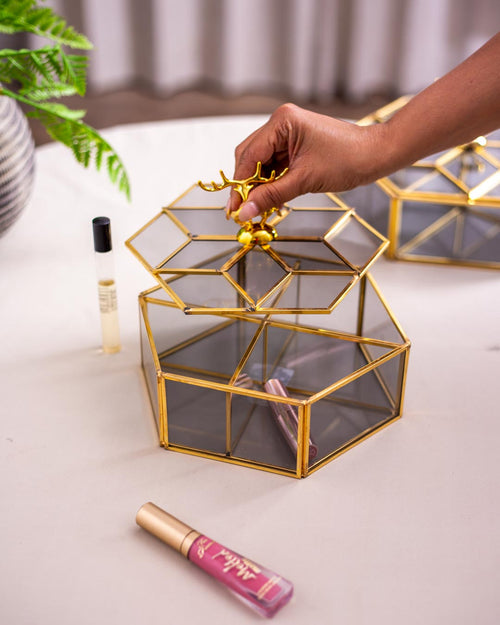 Luxurious Jewellery Box with Entrancing Deer Lid - Large: A luxurious hexagonal jewellery box with a captivating golden deer lid, offering both an enchanting aesthetic and a practical storage solution.