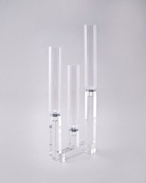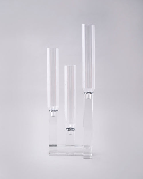 Elegant and minimalistic, the Crystal Clarity Modern Candle Stand is a stunning display of simplicity and sophistication. Designed with three varying-height glass columns, it creates a balanced and modern silhouette that beautifully complements any décor.