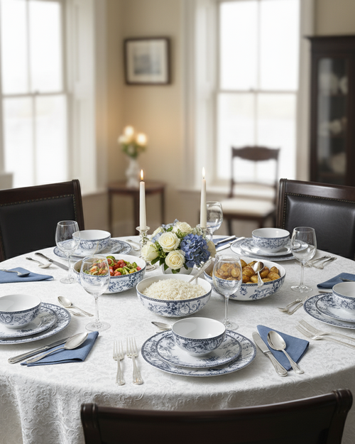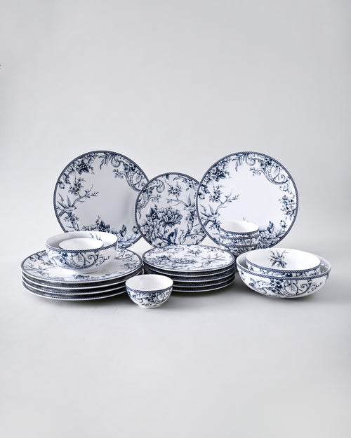 The Adelaide Blue Dinner Set exudes timeless elegance with its intricate blue floral and vine motifs set against a pristine white background. Inspired by classic European porcelain artistry, this set combines traditional charm with modern durability.