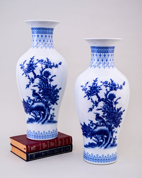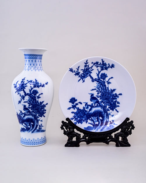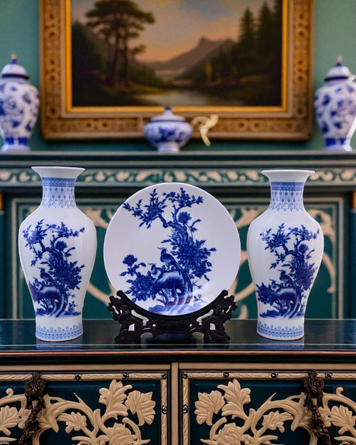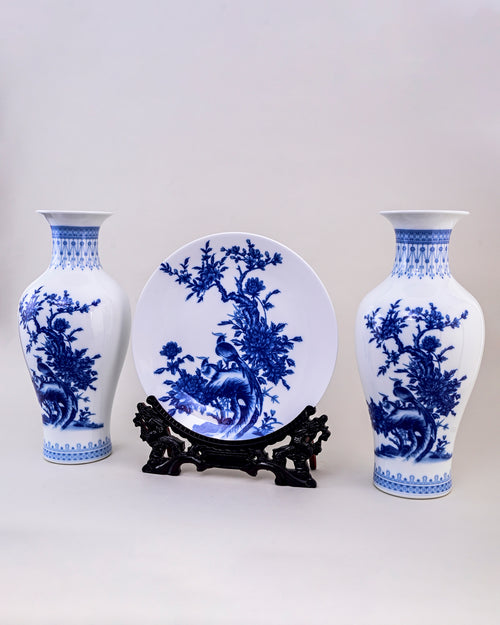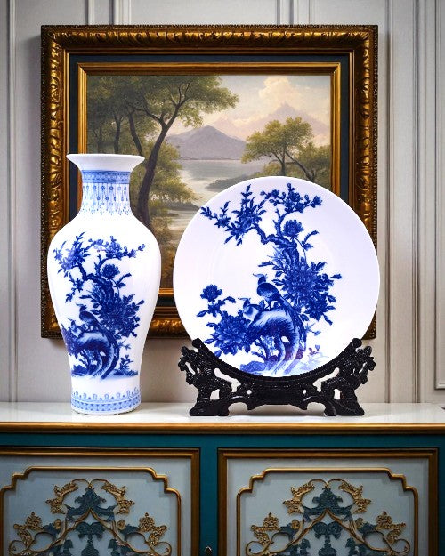 This stunning Bird Branches Ceramic Vase & Decorative Plate features intricate blue bird branches artwork on a crisp white base, reflecting timeless oriental artistry. The pair of vases with a matching decorative plate creates an elegant harmony, perfect for showcasing in living rooms, hallways, or dining spaces.