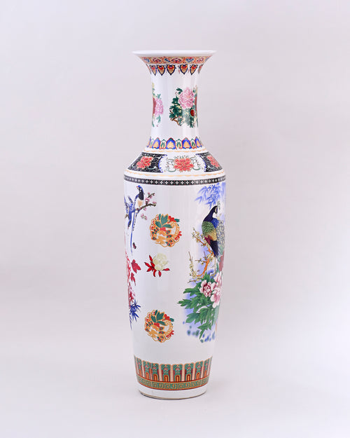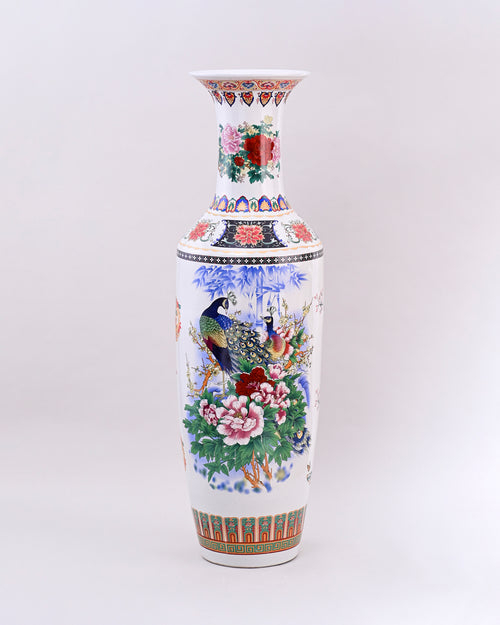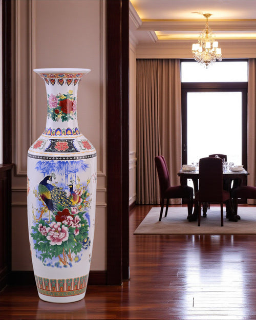 The Majestic Peacock & Blossom Tall Floor Vase is a striking piece of art that blends elegance with cultural symbolism. Showcasing vibrant peacocks surrounded by lush pink and red peonies, it represents beauty, pride, and prosperity. The colorful floral patterns and detailed borders around the neck and base add an intricate, regal charm.