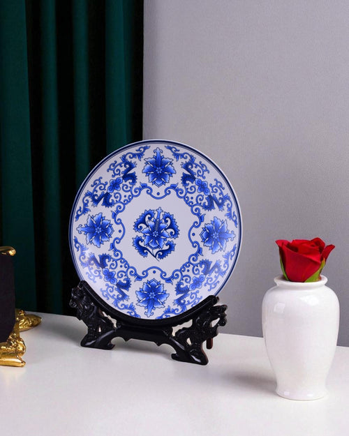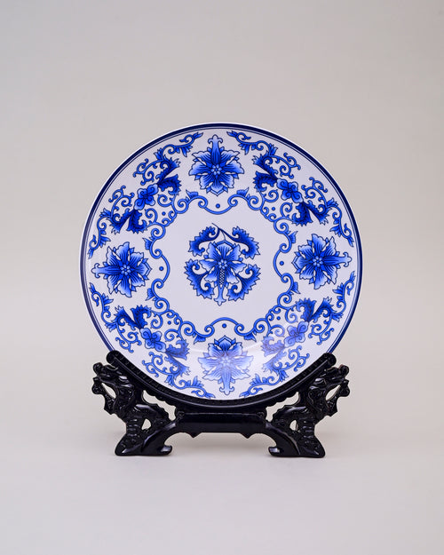 This porcelain plate showcases a classic blue-and-white floral motif, inspired by traditional Chinese artistry. The intricate lotus patterns symbolize purity, peace, and spiritual enlightenment, gracefully arranged in a symmetrical design.