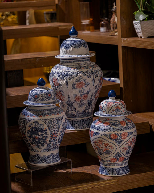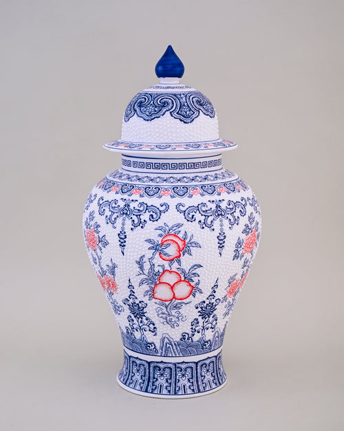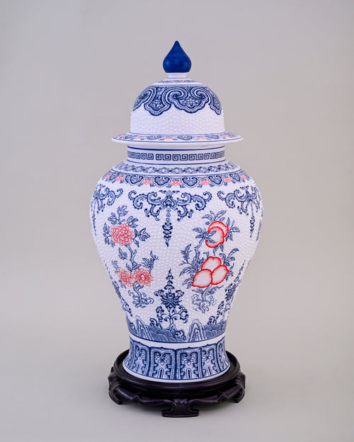 The timeless tranquillity of Oriental ceramics finds fresh expression in this traditional porcelain temple jar. The fluid design wraps around the jar's shapely silhouette and lends subtle beauty with its intricate strokes. Artisans paint the graceful motifs by hand, then hand-fire it for a unique finish and long-lasting beauty. Handmade in the Qing Hua Ci tradition, the porcelain is strewn with hand-painted floral motifs, symbolising royalty - in timeless cobalt blue.