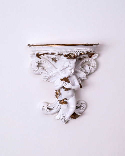 A stunning wall shelf featuring a beautifully sculpted angel cherub holding the ledge with graceful poise. Finished in elegant white with subtle gold accents, this piece exudes classic charm and divine beauty. Perfect for displaying décor items or adding a touch of heavenly elegance to living spaces, hallways, or bedrooms.