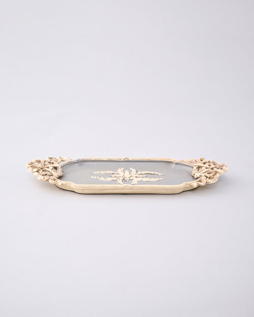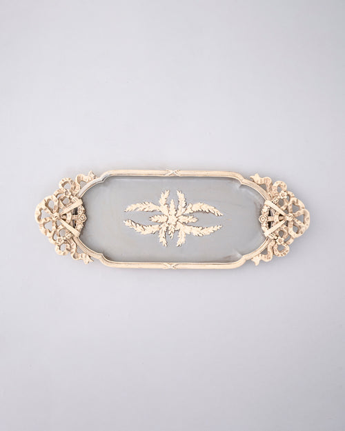 This Antique Bow Handle Tray showcases timeless sophistication with its rectangular shape and delicately curved edges. The tray is adorned with ornate ribbon-and-floral handles on both sides and a raised leaf motif in the center, adding a regal Victorian charm. Finished in a soft ivory tone with subtle antique highlights, it exudes elegance and grace. Perfect for displaying perfumes, jewelry, or candles, this tray brings a touch of vintage luxury and classic refinement to dressing tables or living spaces.