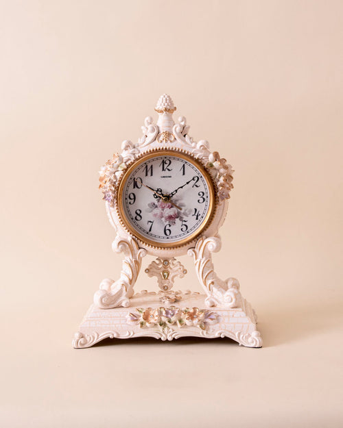 The Antique Grace Floral Clock captures the charm of a bygone era. Featuring a delicately sculpted ivory body with gold accents and hand-painted floral embellishments, it brings warmth and elegance to mantels, side tables, or entryway consoles.