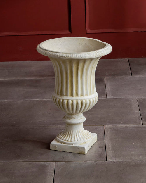 Transform your outdoor space or indoor setting with the regal beauty of this Antique Roman Style Planter. Inspired by classical Greco-Roman architecture, this planter boasts a refined silhouette that combines elegance and artistry. The upper portion is adorned with an interlaced basket-weave pattern, accented by raised decorative knobs, lending it texture and visual interest. Below, rounded flutes taper down into a smooth, pedestal base that rests on a robust square plinth.