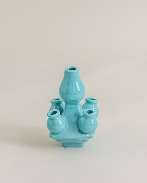 This unique vase features a central tall bud holder surrounded by multiple small rounded mini vases, all beautifully connected on a single base. The glossy aqua finish gives it a fresh and soothing appeal, creating a modern yet playful look.