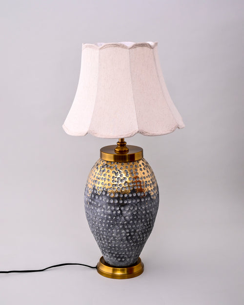 The Auric Dusk Textured Table Lamp blends warm luxury with modern artistry. Its tall, hand-finished base features a striking hammered pattern that transitions from radiant gold to soft charcoal grey, creating a beautiful gradient effect. Paired with a classic fabric shade and gold accents, it offers a warm, ambient glow while standing out as a sophisticated décor piece. Perfect for consoles, bedside tables, or living rooms that need a touch of refined glamour.