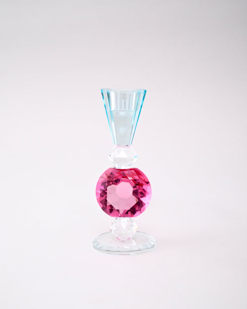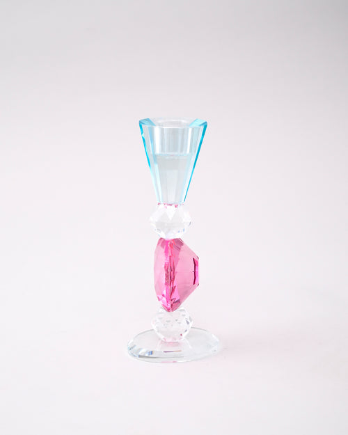 A stunning crystal candle stand featuring a captivating mix of pastel blue and vibrant pink hues. The design showcases a large faceted pink gem at the center, balanced by clear crystal accents and a sleek blue cone-shaped top.