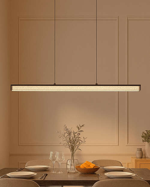 The Aurora Linear Crystal Pendant Light features a sleek and minimalist design, combining modern elegance with functional lighting. The fixture consists of a long, horizontal LED light encased in a crystal-like diffuser, suspended by two thin, barely-there cables from a rectangular ceiling canopy.