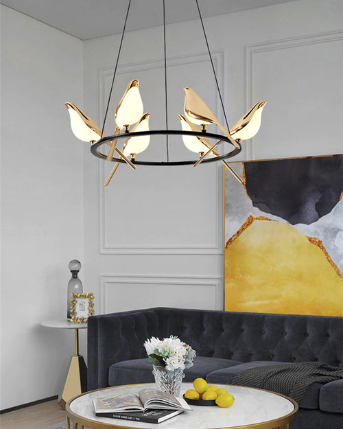 Bring the beauty of nature indoors with this exquisite Aves 6 sitting birds chandelier. With its gold finish and graceful design, this hanging light is sure to add elegance to any décor. Plus, it's energy-efficient, so you can enjoy the beauty of this chandelier without worrying about your electricity bill.