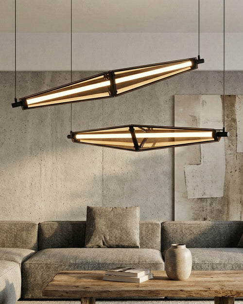 The Axiron TwinLine Pendant Light features slim linear LED bars suspended at dynamic angles with a matte-black frame. Its bold, industrial silhouette delivers focused illumination and a contemporary edge—perfect for dining tables, kitchen islands, and modern loft-style interiors.
