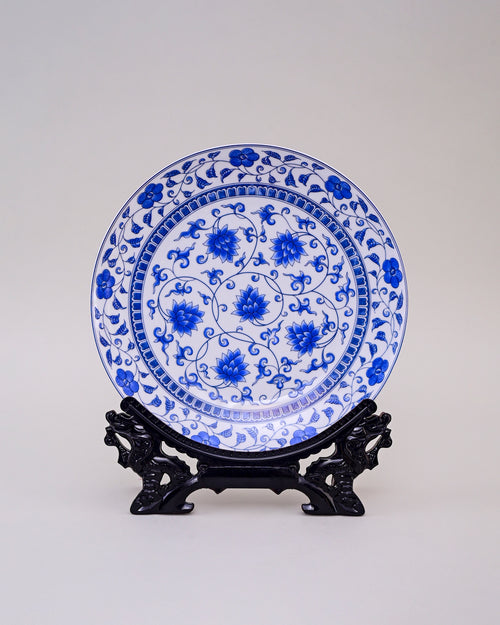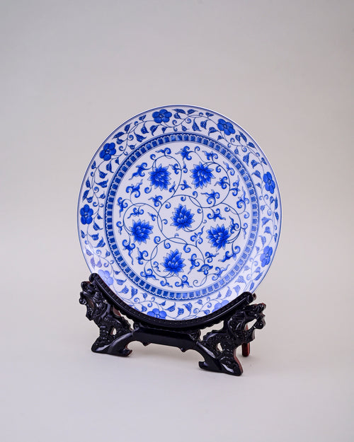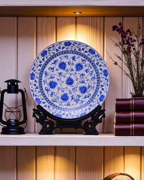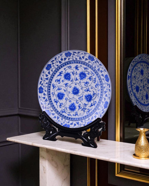 This Azure Blossom Harmony Decorative Plate features an elegant blue floral design, with delicate blossoms and swirling vines arranged in perfect symmetry. The cobalt blue detailing against the pristine white background reflects the timeless artistry of classic blue-and-white porcelain. Symbolizing purity, peace, and balance, this decorative plate is a refined statement piece ideal for collectors and interior décor.