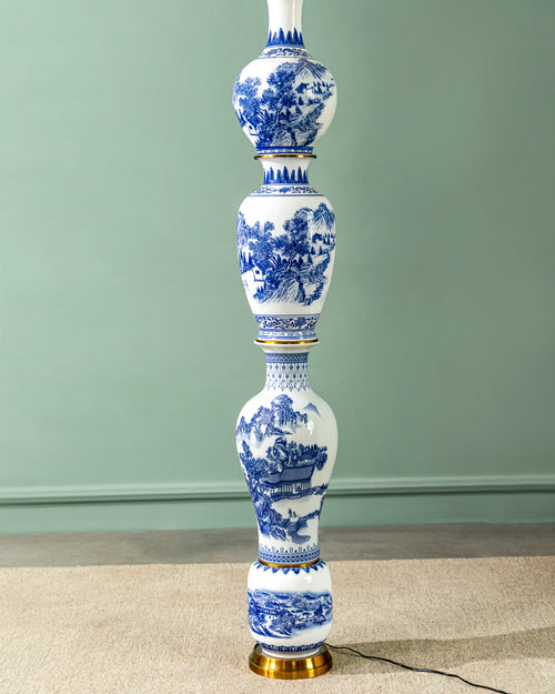 This elegant floor lamp features a tall, stacked ceramic silhouette crafted in classic blue and white porcelain. Inspired by traditional oriental motifs, its hand-detailed landscape patterns add timeless charm and artistic depth.