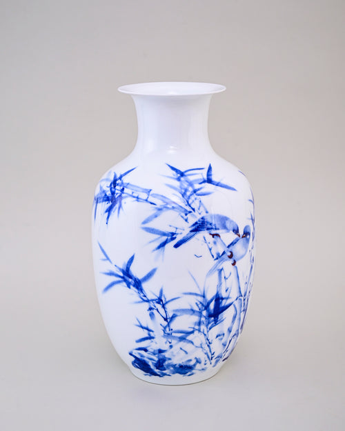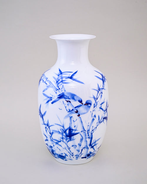 This Bamboo Harmony Bone China Vase features a serene hand-painted design of birds resting on bamboo branches, symbolizing harmony, strength, and peace. The rich blue artwork on the glossy white base creates a refined and timeless appeal, perfect for both traditional and contemporary interiors.