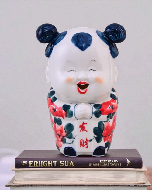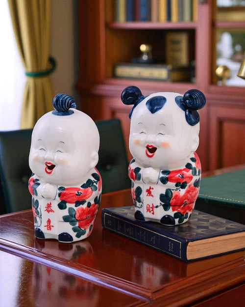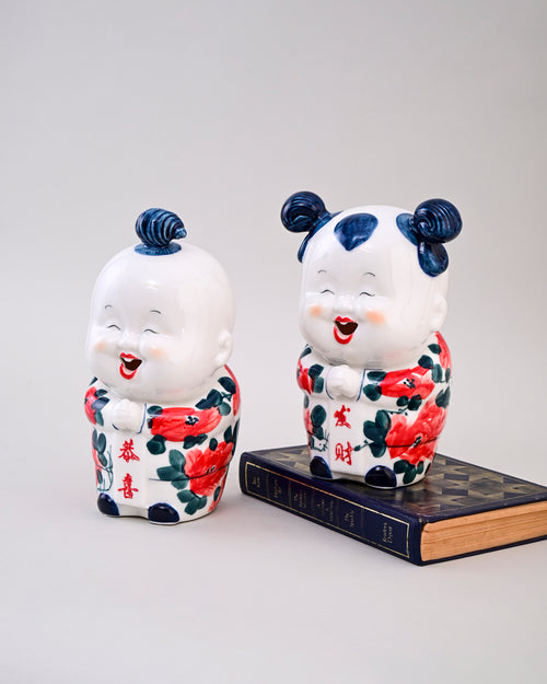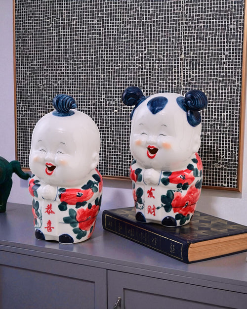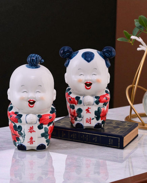 The Blissful Blessing Kids Figurine set radiates joy, prosperity, and positivity through its delightful design. Crafted from fine porcelain, these adorable figurines feature smiling children dressed in vibrant floral-patterned attire, with folded hands symbolising blessings and good fortune.