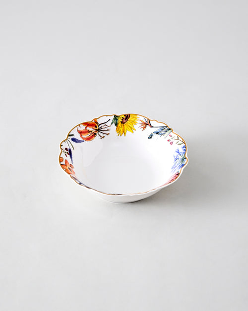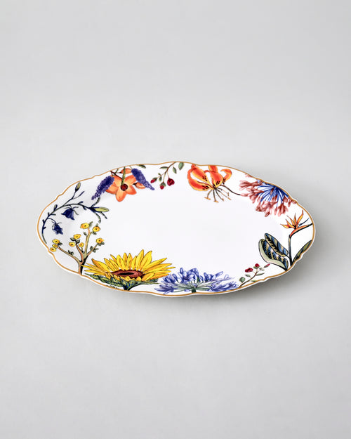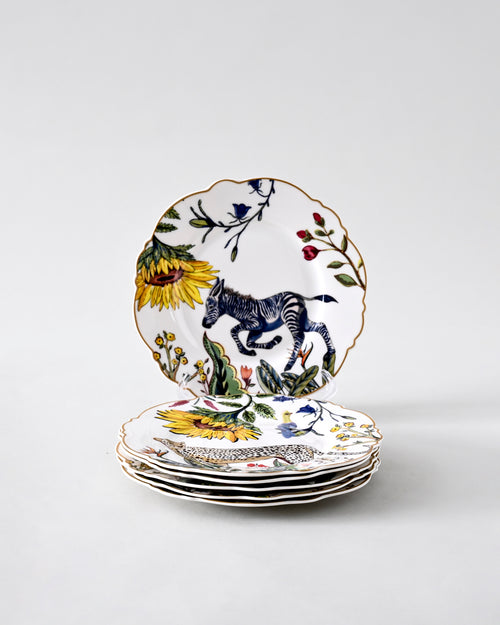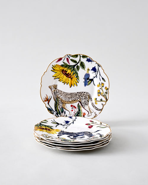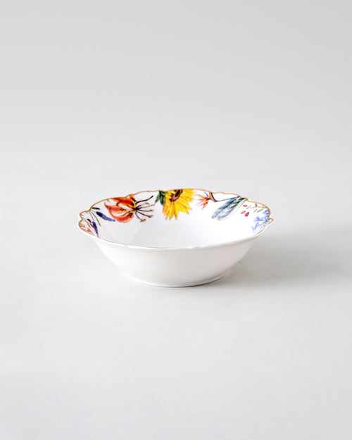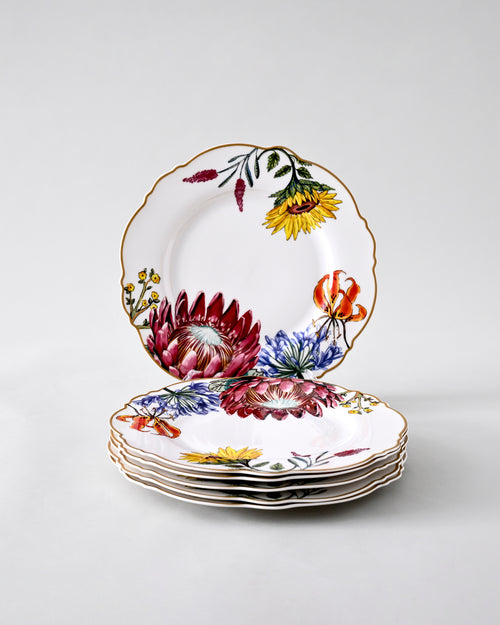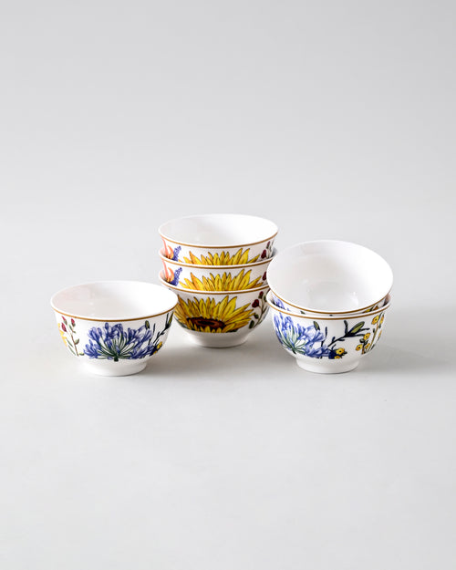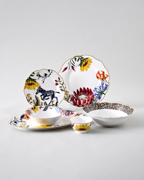 This exquisite dinner set showcases a vibrant hand-painted floral design that brings the beauty of nature to your dining table. Crafted from ceramic, each piece features a mix of bold sunflowers, lilies, and wild blossoms in rich, lively colors, bordered with delicate golden edging for a touch of sophistication.