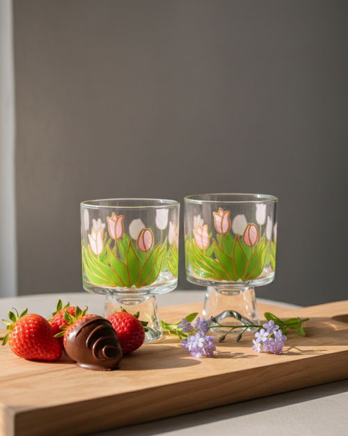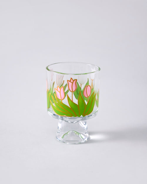 A beautifully crafted glass featuring hand-painted tulip motifs in soft pink and green hues. Its elegant pedestal base and cylindrical shape add a vintage charm, making it perfect for serving desserts, cocktails, or displaying as a decorative accent. The floral design brings a fresh, spring-inspired elegance to any table setting.