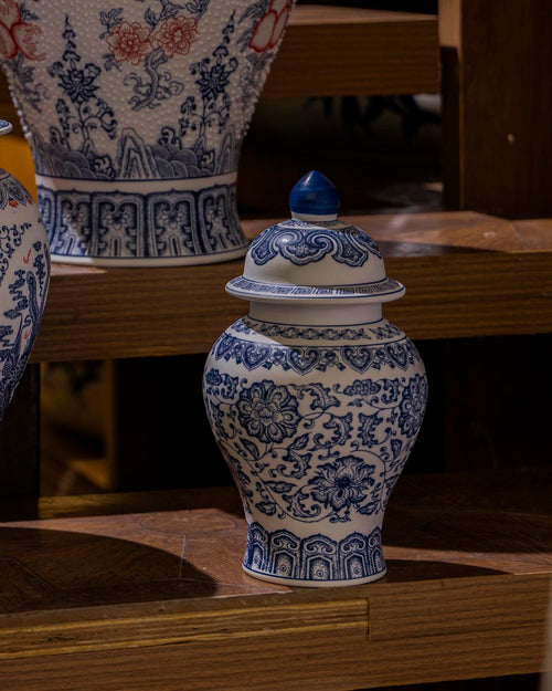 This elegant Temple Jar is crafted from ceramic, beautifully decorated with intricate cobalt-blue floral motifs on a white base. Its traditional lidded design, symbolizes grace and timeless artistry.