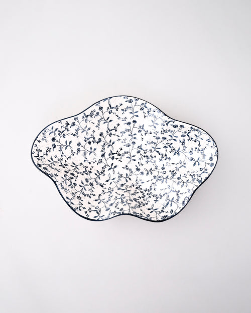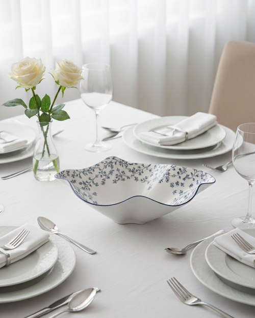 The Blue Blossom Wavy Ceramic Bowl showcases timeless elegance with its handcrafted floral print in classic blue tones. The bowl’s unique wavy edge and organic flowing shape give it an artistic and contemporary charm. Designed with delicate vine and flower motifs, it captures the beauty of nature in every curve.