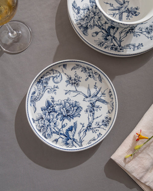 Premium white ceramic plate with elegant blue floral & bird artwork inspired by classic chinoiserie style. Everyday dining, special dinners aur table décor ke liye perfect. Smooth glossy finish, durable material, easy to clean.