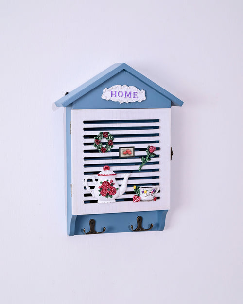 A charming house-shaped wooden key box designed in soothing blue and white tones. The front panel features delightful 3D décor including a teapot, teacup, wreath, and rose accents along with a “HOME” plaque at the top, giving it a cozy cottage vibe. Inside, multiple hooks offer ample space for organizing keys neatly, while exterior metal hooks add extra utility. Perfect for adding both function and rustic charm to your entryway or hallway.