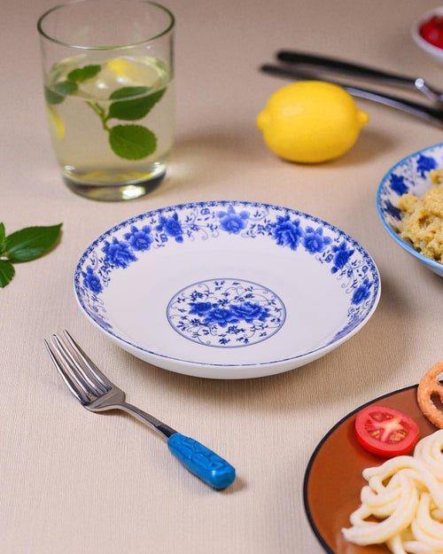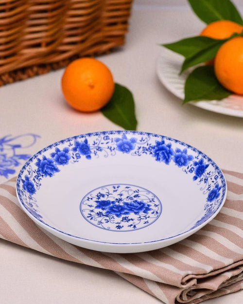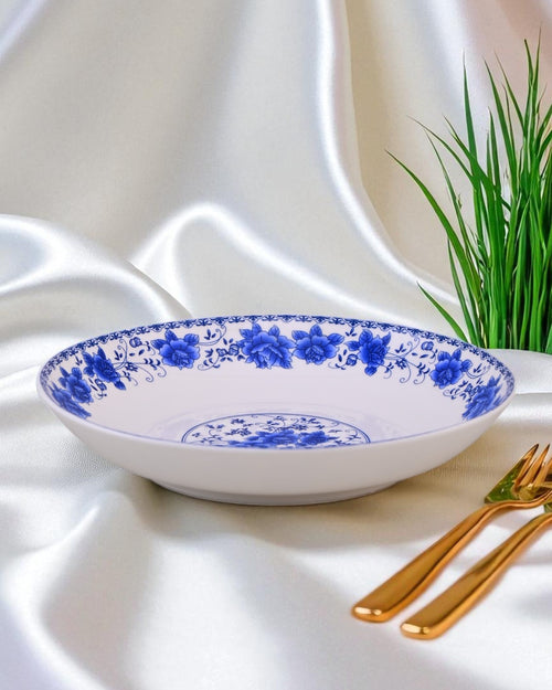 Dine in style with the Blue Eden Pasta Bowl, featuring a graceful floral rim and a delicately detailed central motif. The crisp white ceramic base is beautifully accented with vivid cobalt blue florals, making it a perfect choice for both everyday meals and elegant dinner settings. Ideal for pasta, salads, noodles, or even desserts.