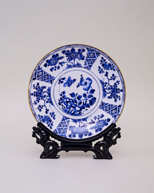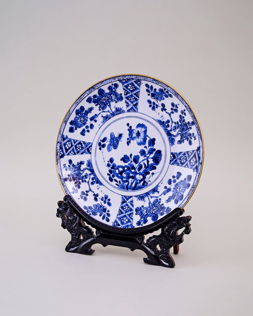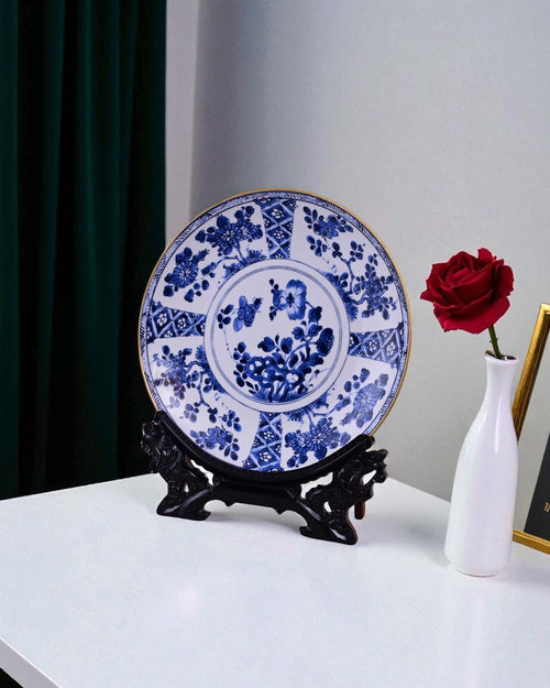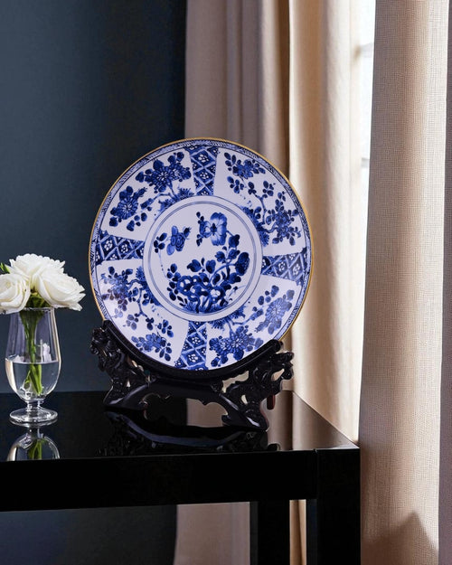 This Blue Floral Medallion Decorative Plate features an elegant arrangement of blooming flowers in rich cobalt blue, framed within a medallion-style design. Alternating panels of floral sprays and geometric lattice patterns enhance its visual depth, reflecting the artistry of traditional blue-and-white porcelain.