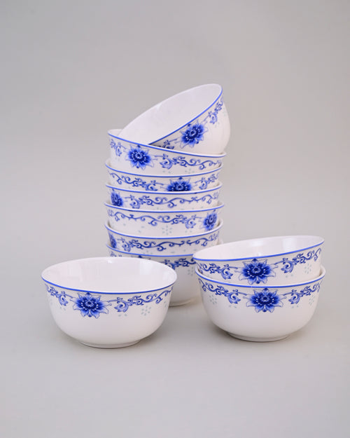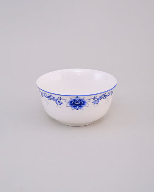 This porcelain bowl features a delicate blue floral motif, beautifully hand-painted around the rim. The elegant white base enhances the refined blue design, giving it a timeless and classic appeal. Perfect for serving or as a decorative accent, this bowl blends functionality with artistic charm, making it suitable for everyday use or special occasions.