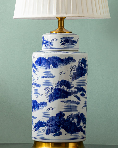 The Blue Landscape Porcelain Table Lamp features a beautifully crafted ceramic base adorned with artistic blue landscape motifs on a crisp white background, inspired by traditional oriental porcelain designs. The scenic pattern adds depth and elegance, while the warm brass-finished base and neck enhance its refined look.
