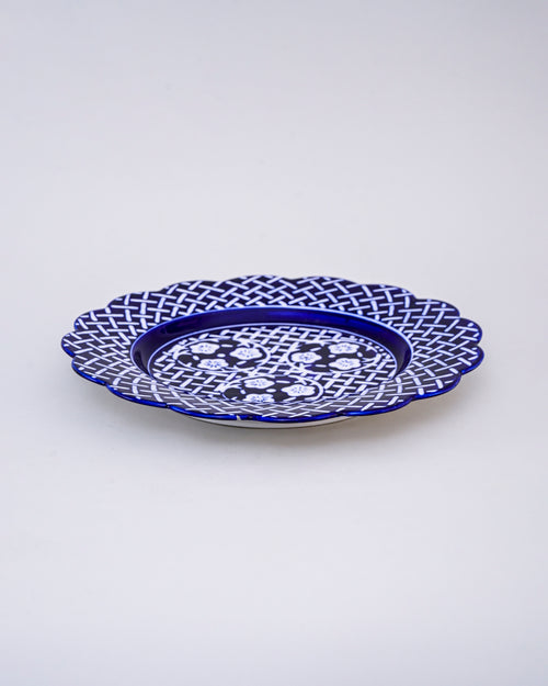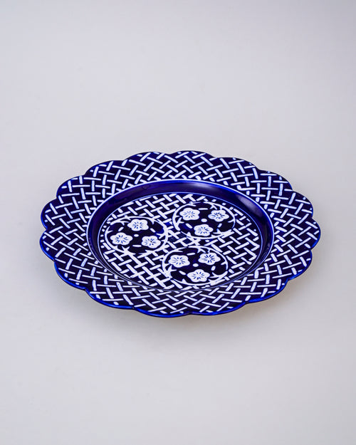 The Blue Lattice Scalloped Edge Platter combines traditional elegance with a modern artistic touch. Featuring a rich blue and white floral lattice design with scalloped edges, it stands out as both a functional serving piece and a decorative accent.
