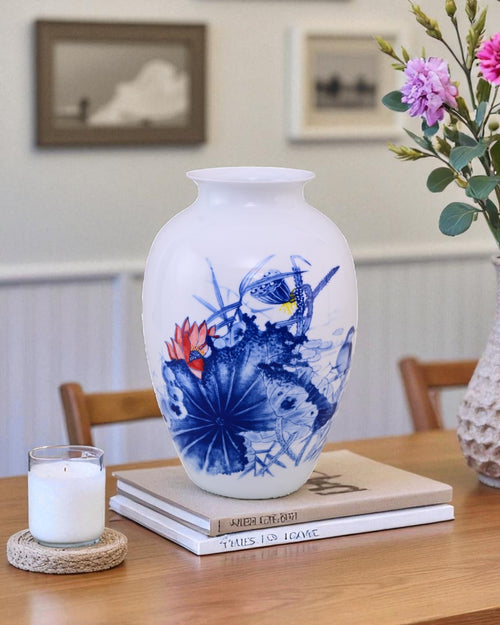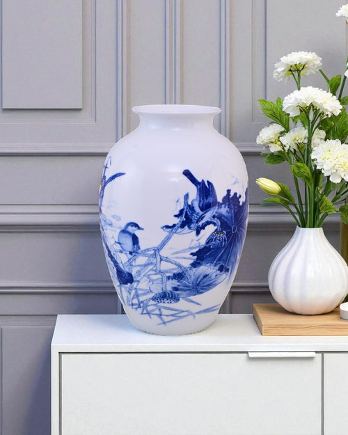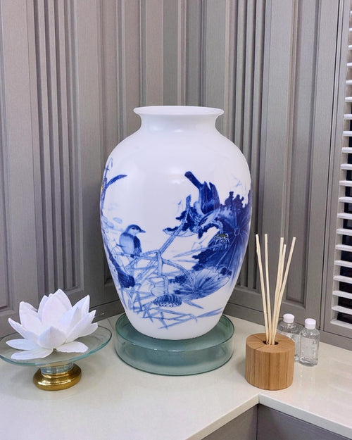 This exquisite Bone China vase features a hand-painted blue lotus design, symbolizing purity and grace. The delicate artwork on a smooth white background creates a calming and luxurious look, perfect for both modern and traditional interiors.