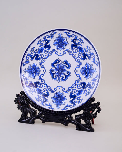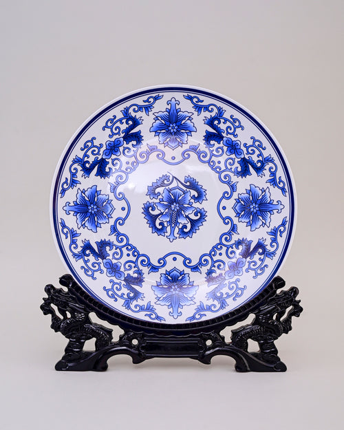 This porcelain plate showcases a classic blue-and-white floral motif, inspired by traditional Chinese artistry. The intricate lotus patterns symbolize purity, peace, and spiritual enlightenment, gracefully arranged in a symmetrical design.