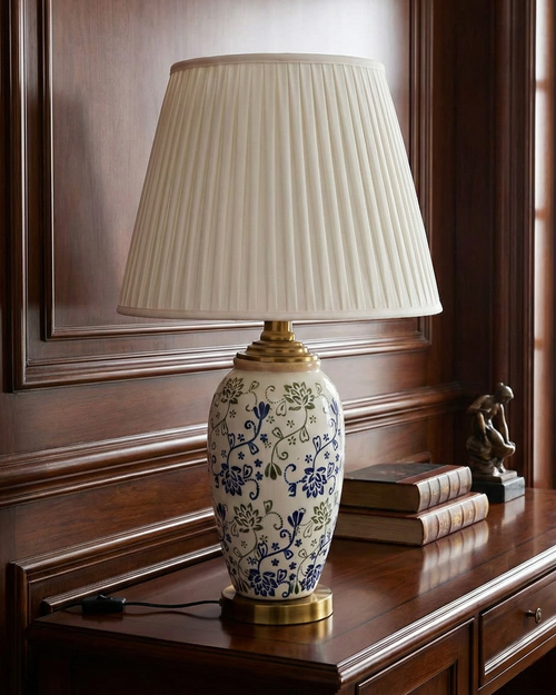 Brighten your home with the graceful charm of the Blue Meadow Porcelain Table Lamp. Its beautifully crafted ceramic base features delicate blue and olive floral patterns inspired by blooming spring gardens. Paired with a warm pleated shade and a classic gold-toned base, it casts a soft, cozy glow that enhances bedrooms, living rooms, and reading nooks alike. Elegant, refreshing, and timeless—this lamp brings a touch of natural beauty to any décor setting.